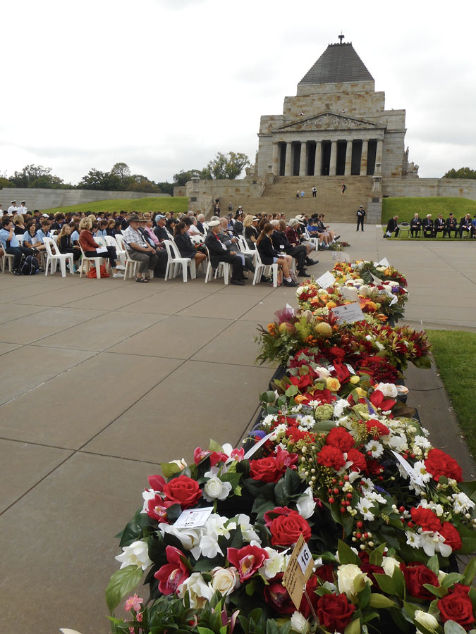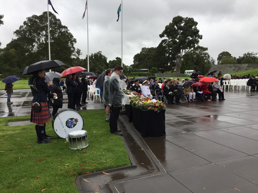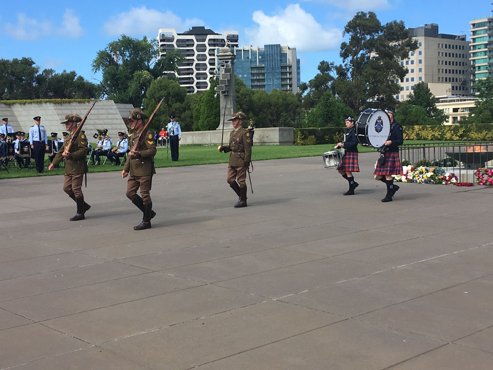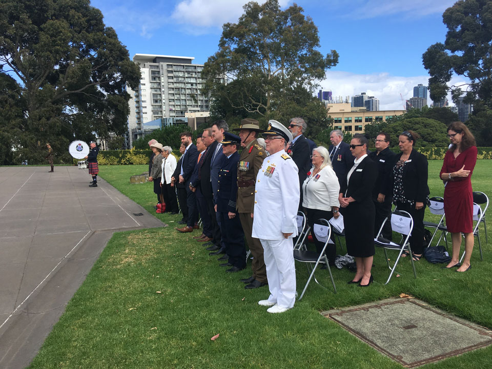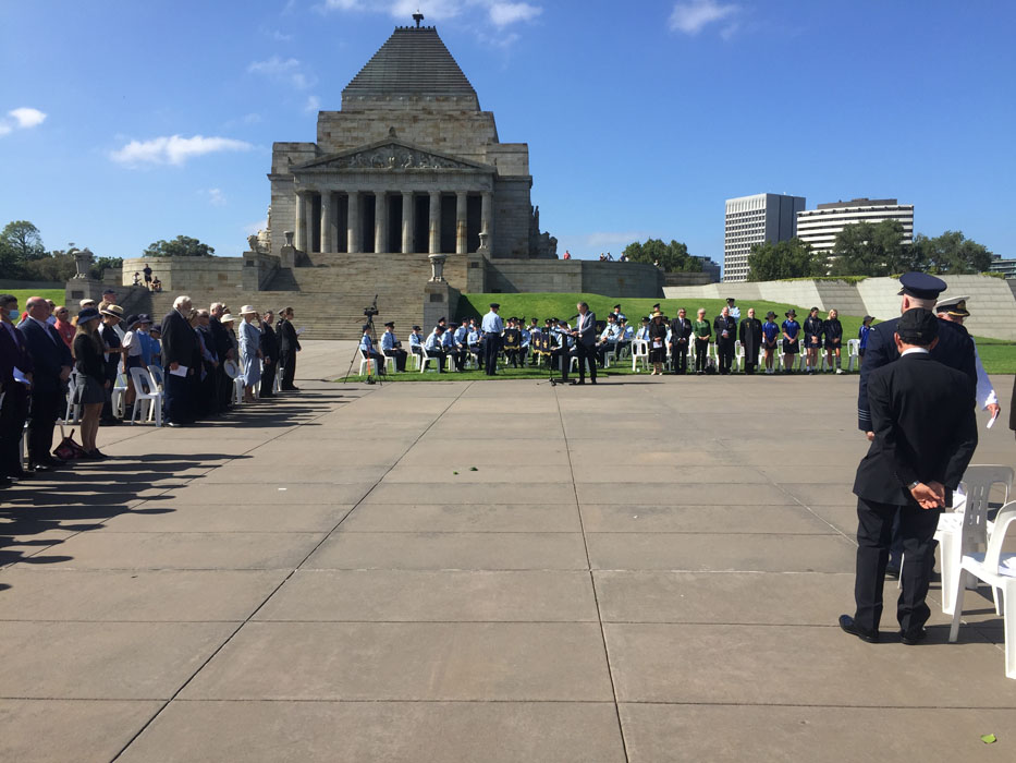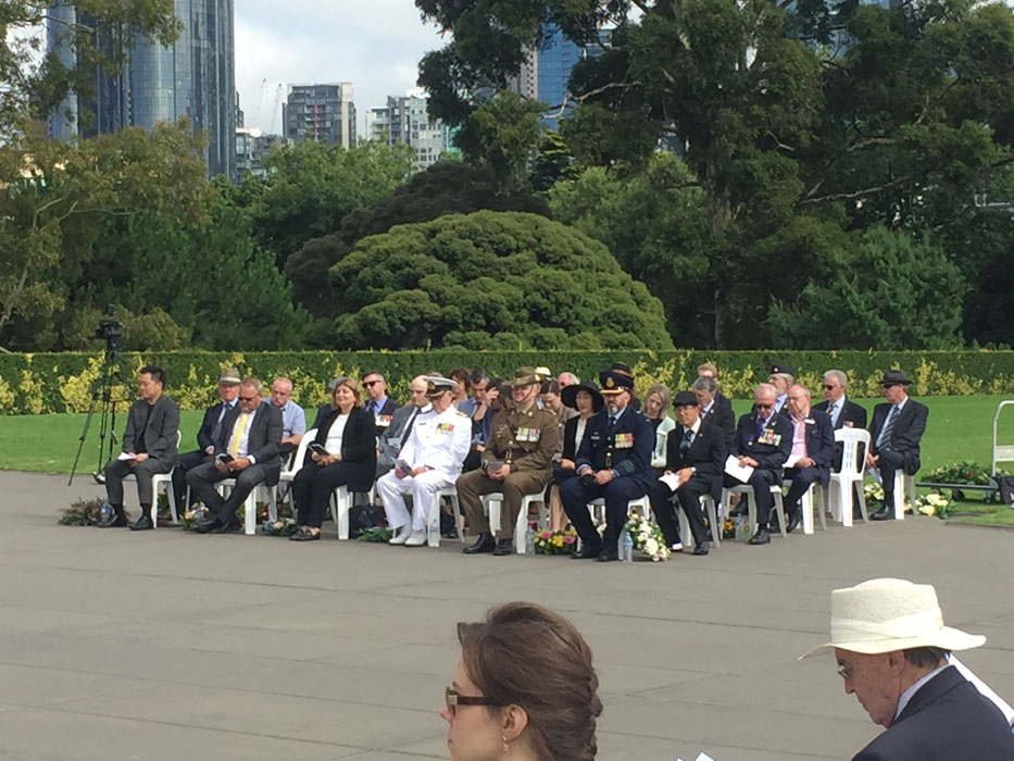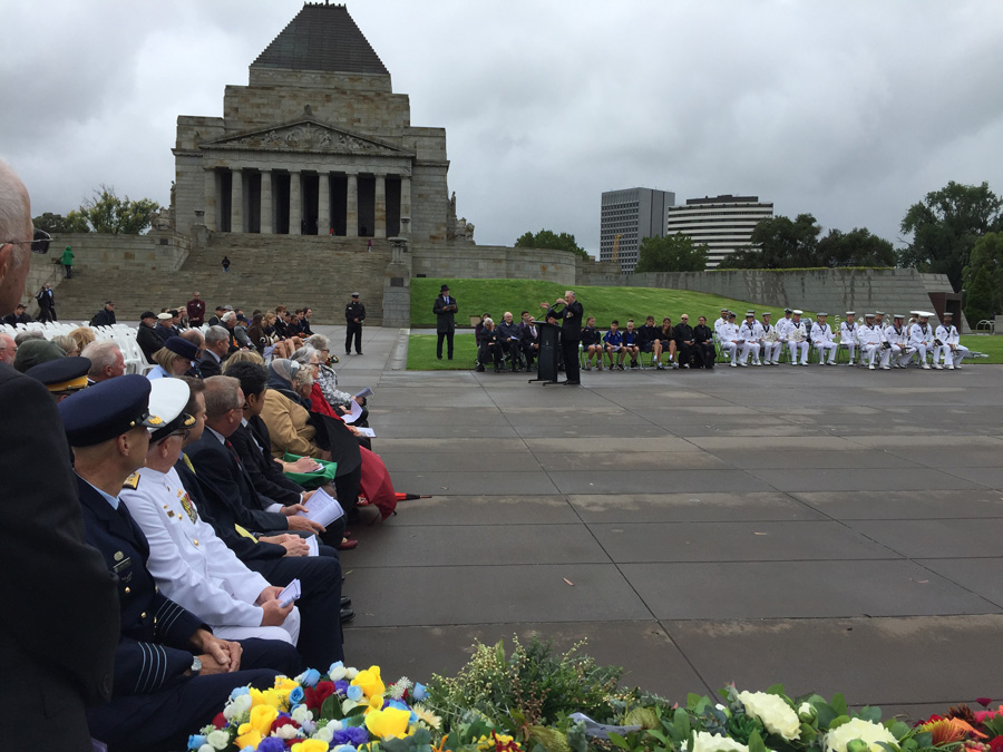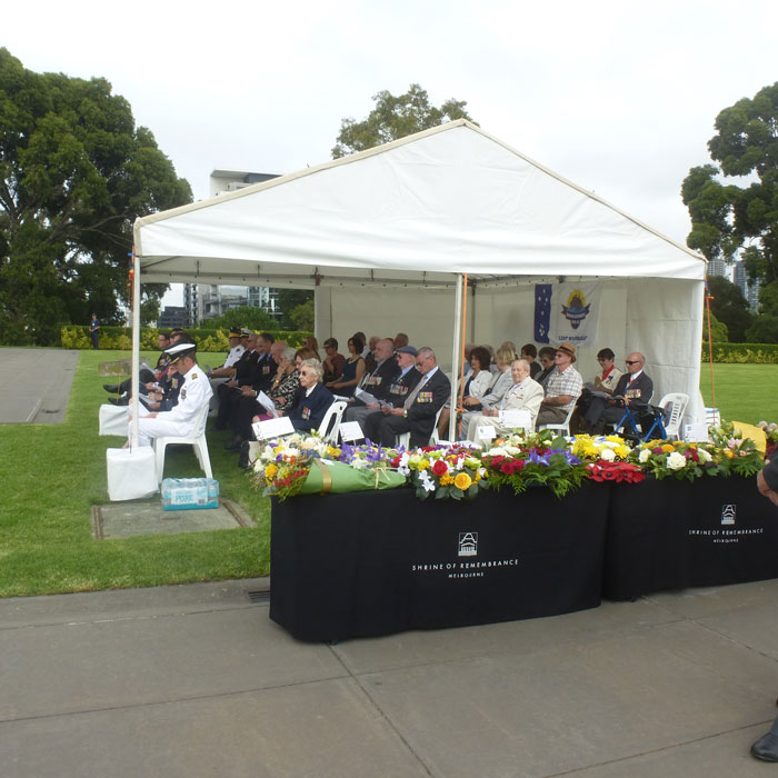 The Music for the service was provided by the Australian Army Band Melbourne and the Catafalque party attended from HMAS Cerberus. The Ode was recited by Dr Robert Webster OAM, President of RSL Victoria and Reverend Siôn Gough Hughes from the Wesley Church in Melbourne led the prayers.