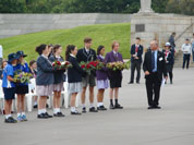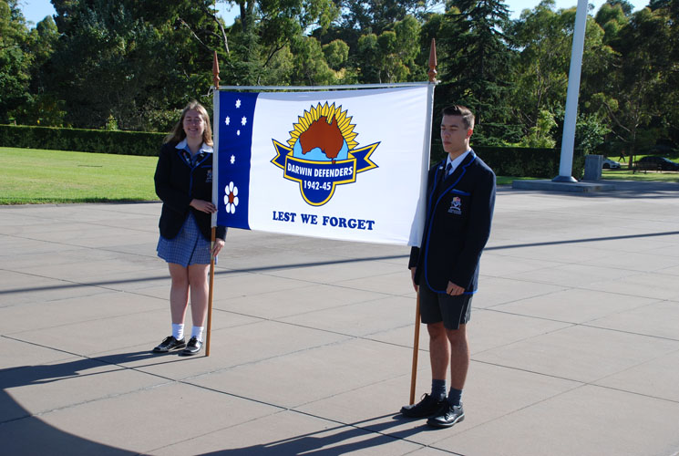 Piper, Mr Alan Davidson played a moving lament whilst Mr Alan Day KCSJ FAIM - President of the Melbourne Branch of the Darwin Defenders marched from the Flag Poles to the Flame. Students from Wesley College Glen Waverley and Ivanhoe Girls Grammar School accompanied Mr Day and held the Darwin Defenders Banner with pride.
