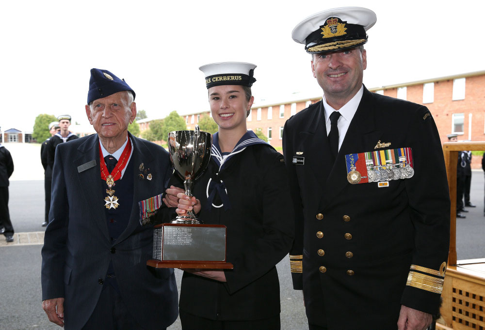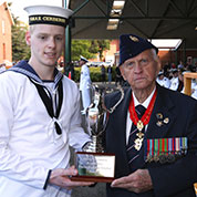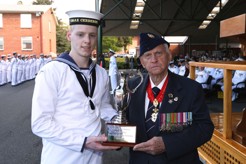Mr Alan Day, President of the Darwin Defenders presented Recruit Electronics Technician Submariner Stephen Scartaccini with the 'Academic of the Intake' award during his graduation ceremony from General Entry 349 Emms Division held at Recruit School, HMAS Cerberus, Victoria.
